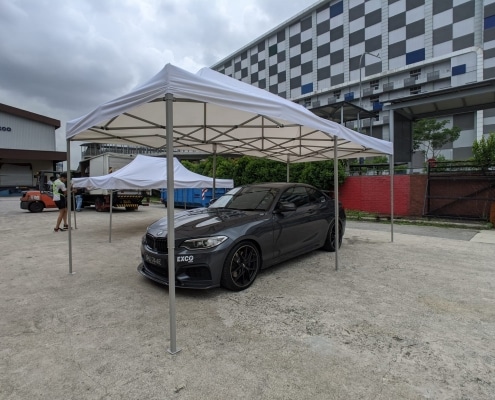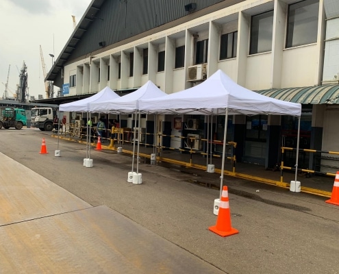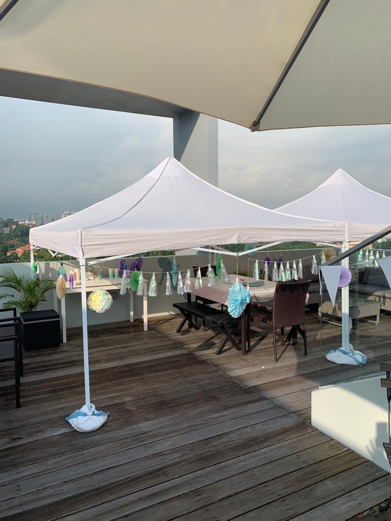 Portable Tents or also known as Ez tent is a popular choice for small events and gatherings. They are usually used as party tents and can be easily decorated or just a temporary shelter against the elements, Portable gazebo tents are essential for any kind of outdoor events. Not only are they very portable, they cost much lesser than our gazebo tentages to set up. The main difference between the gazebo tentage and the portable tents are that the gazebo tents have a much sturdier and stronger construction due to the thick beams. Portable tentages, on the other hand, should only be used at locations where the wind isn’t that strong and for temporary use. They are slightly shaky when rocked and should not be used for heavy-duty use. This is due to the fact that poles are much thinner and weaker which is also the trait that makes them portable. Our tentages can be combined to form a larger tent and to also increase the stability of the tent. We usually use sandbags, water weights or other forms of weight to secure the bases of the tentage. This way, it gives it more stability against strong winds and also adverse weather conditions. If you would like to rent for a long duration or would like to purchase. please contact us at our email or the easy call buttons above.