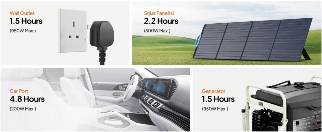 Fast Recharge: 950W Turbo Charging reaches 80% in just 45 minutes. DuroMaxThree charging modes (Turbo / Standard / Silent at 45dB) controlled via the app. Recharge via AC wall outlet, solar (500W max, 12–58V), car (12V/24V), generator, or expansion battery.