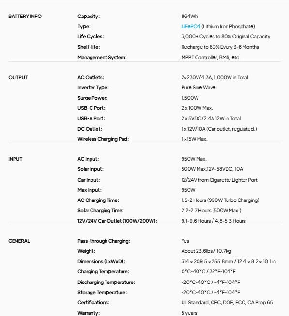 Battery: 864Wh LiFePO4, 3,000+ life cycles to 80%
