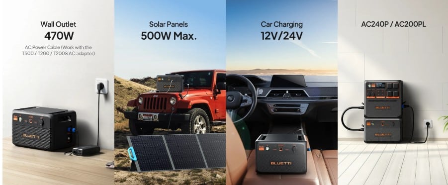 Recharge Options: Up to 500W solar input (11–60V, MC4 connectors), AC wall outlet, or car charger Batteries— either standalone or paired with a host power station.